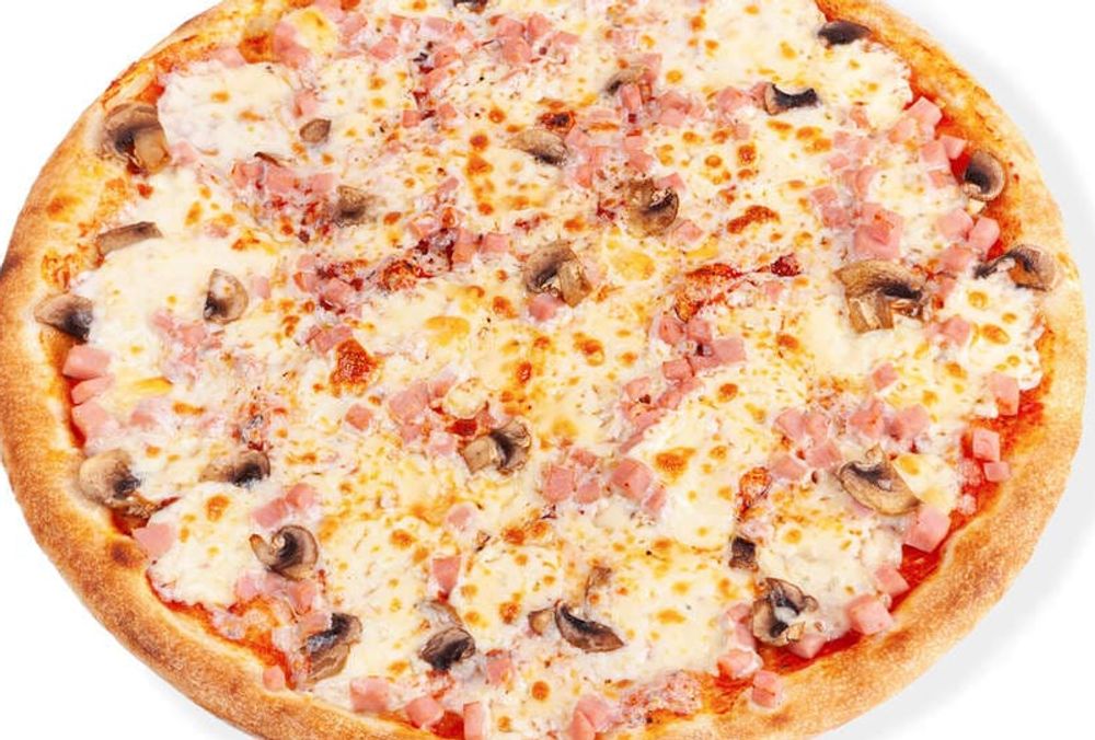 Пицца на пышном тесте, соус сливочный. В составе ветчина, грибы жаренные шампиньоны, сыр моцарелла.