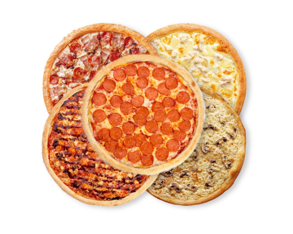 Пицца Пепперони 33 см, охотничья 33 см, гавайская, джульетта 33 см, барбекю 33 см.